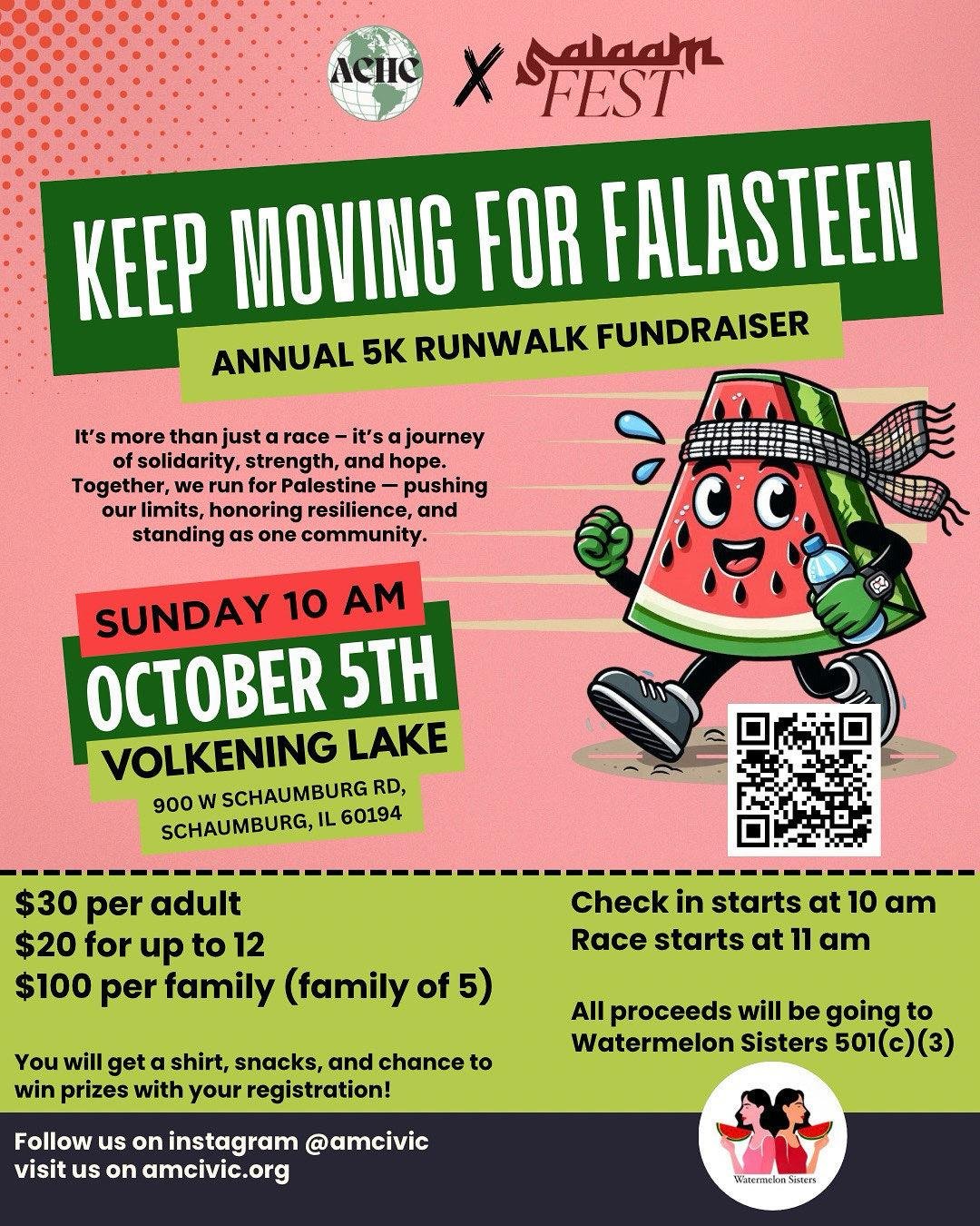 KEEP MOVING FOR FALASTEEN Join us for our Annual 5K Run/Walk Fundraiser — a day of solidarity, strength, and community Volkening Lake (900 W Schaumburg Rd, Schaumburg, IL 60194) Sunday, October 5th Check-in: 10 AM | Race: 11 AM Registration: $30 per adult $20 per youth (up to age 12) ⚪️$100 per family (family of 5) Includes: shirt, snacks, and raffle prizes! All proceeds benefit @watermelonsisters24 501(c)(3) Sign up today! Link in bio! Scan QR code! https://bit.ly/Move5k Let’s keep pushing for Palestine, honoring resilience, and standing as one community Hosted by: @amcivic x @salaamfestusa