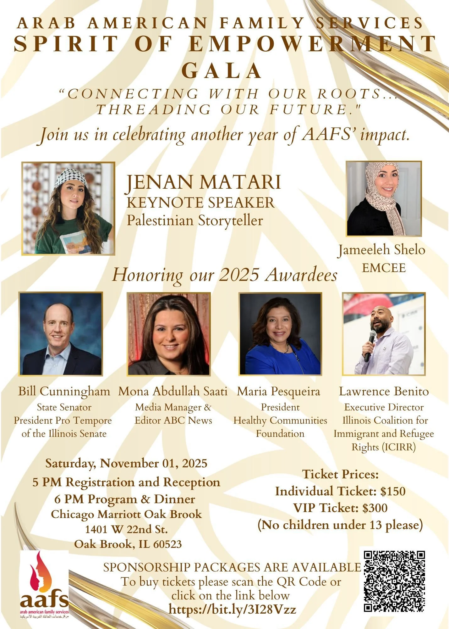 Join Us for the AAFS Spirit of Empowerment Gala! For over 24 years, Arab American Family Services (AAFS) has been a staple in our community—founded by two Muslim women Nareman Taha and Itedal Shalabi who saw the urgent need for accessible social services for families facing religious and language barriers. Today, AAFS continues to empower, serve, and uplift thousands across our community. Date: Saturday, November 1, 2025 Location: Chicago Marriott Oak Brook, 1401 W 22nd St, Oak Brook, IL Program: • 5:00 PM – Registration & Reception • 6:00 PM – Dinner & Program Keynote Speaker: JENAN MATARI – outspoken Palestinian artist, storyteller, and new author Honoring incredible leaders making an impact in Illinois Tickets: • Individual: $150 • VIP: $300 Secure your spot today! https://bit.ly/3128Vzz